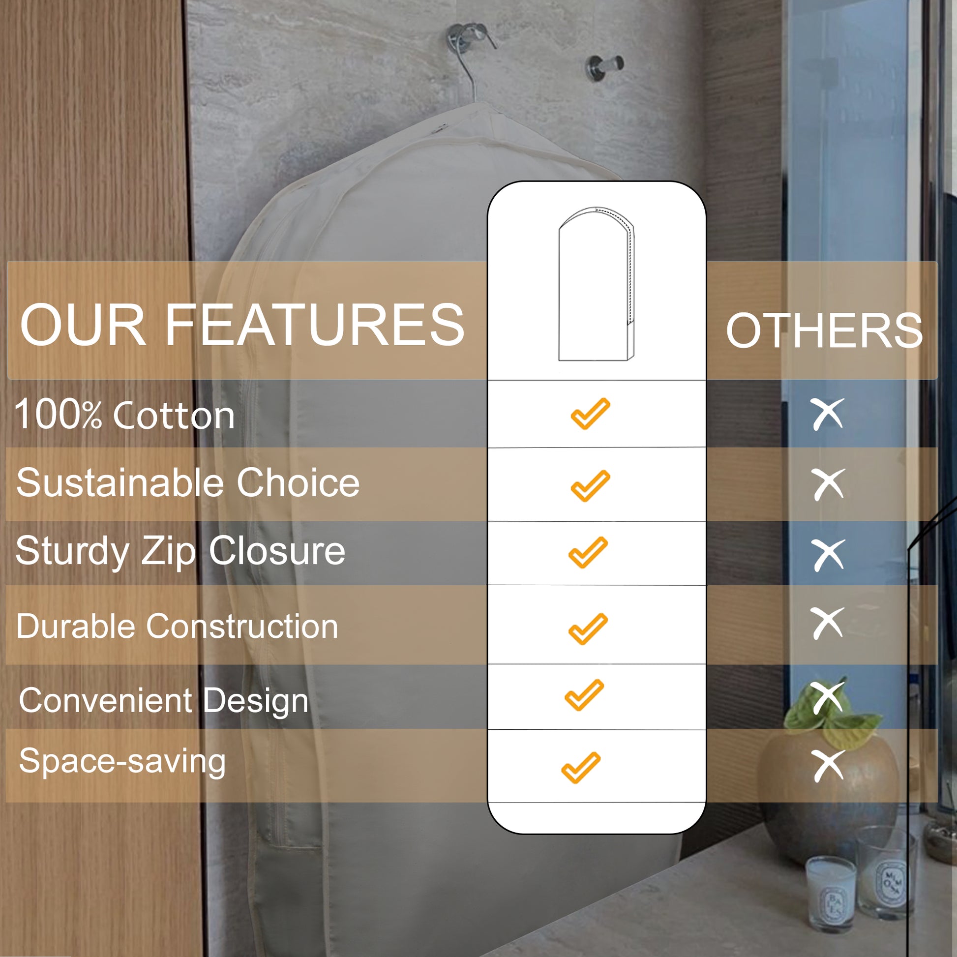 🍀 Eco-Friendly: Cotton garment bags are made from natural cotton fibers, which are renewable and biodegradable. Unlike plastic garment bags, which can take hundreds of years to decompose and cause harm to the environment, cotton bags can be easily recycled or composted.